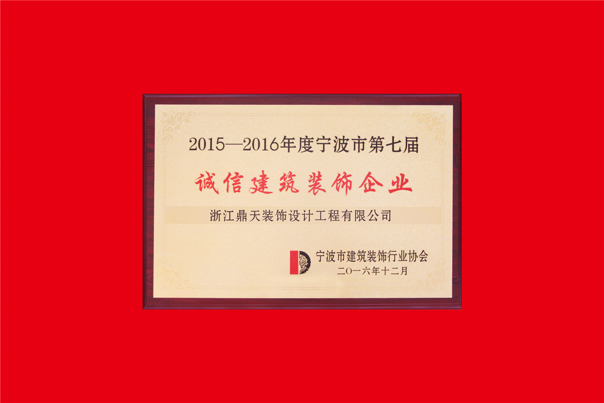 根據(jù)《寧波市建筑裝飾行業(yè)協(xié)會(huì)關(guān)于舉辦2013-2014年度寧波市第六屆誠(chéng)信建筑裝飾企業(yè)評(píng)選活動(dòng)的通知》經(jīng)寧波市建筑裝飾行業(yè)協(xié)會(huì)公開、公平、公正的原則,將“寧波市第六屆誠(chéng)信建筑裝飾企業(yè)”頒發(fā)于《浙江鼎天裝飾設(shè)計(jì)工程有限公司》。