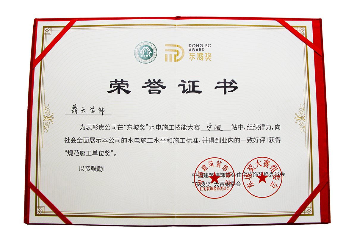 本次大賽,鼎天裝飾工程管理中心率先獲得團體獎。此次頒獎典禮,東坡獎寧波站優秀水電技師俱樂部”成立儀式也同期舉行,由鼎天裝飾總經理麻宏偉攜手國內知名裝企領導人上臺為“東坡獎寧波站優秀水電技師俱樂部”揭牌,與現場千余名來賓一起見證了寧波市優秀水電技師俱樂部成立這一重要時刻!