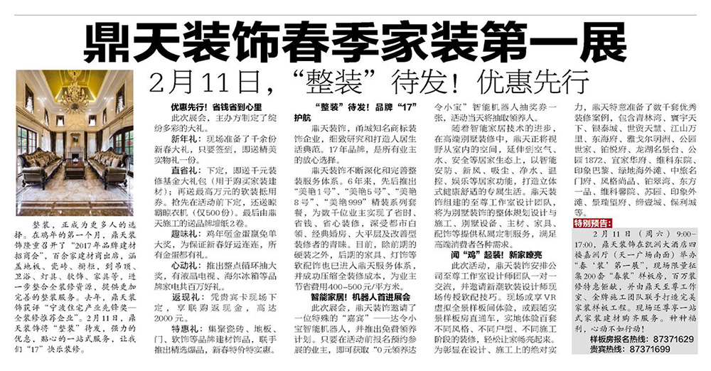特別預(yù)告: 2月11日(周六)9:00-17:00,鼎天裝飾在凱洲大酒店四樓嘉洲廳(天一廣場(chǎng)南面)舉辦“春‘裝’第一展”,現(xiàn)場(chǎng)限量征集200套“春裝”樣板房,百萬(wàn)裝修特惠鉅獻(xiàn),并由鼎天至尊工作室、金牌施工團(tuán)隊(duì)聯(lián)手打造完美家裝樣板工程?,F(xiàn)場(chǎng)還尊享一站式家裝建材購(gòu)齊服務(wù)。種種福利,心動(dòng)不如行動(dòng)! 樣板房報(bào)名熱線(xiàn):87371629 貴賓熱線(xiàn):87371699