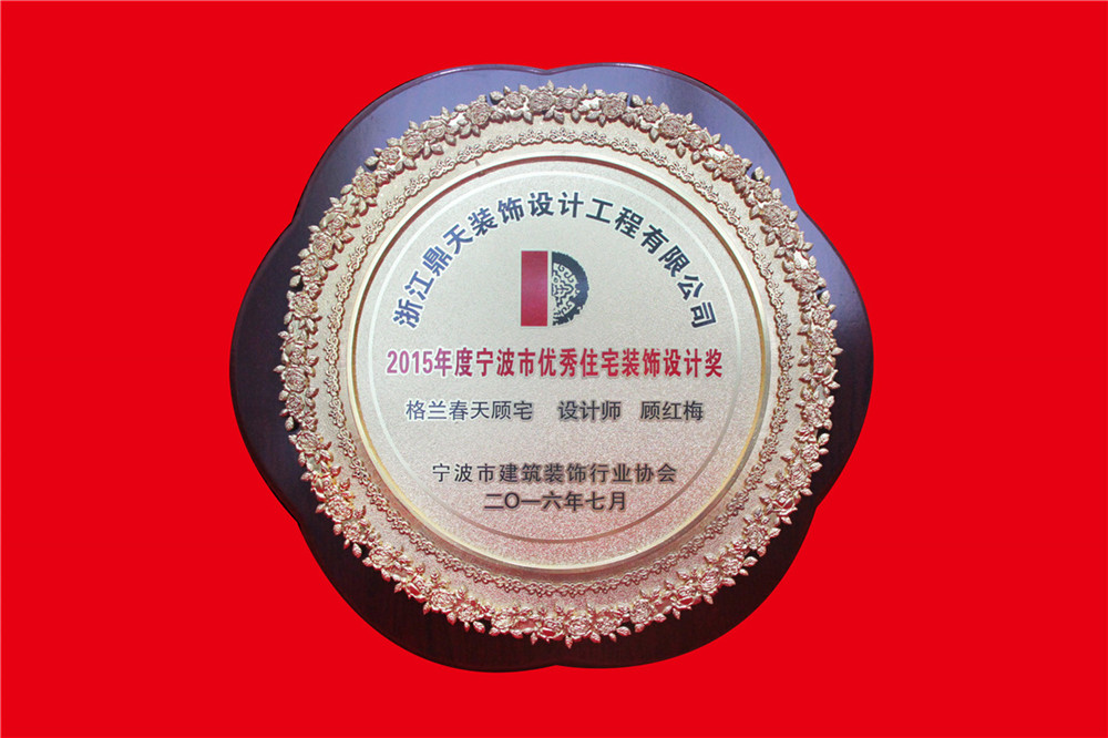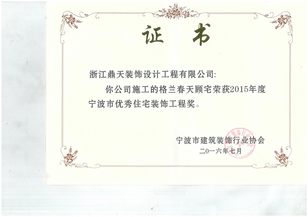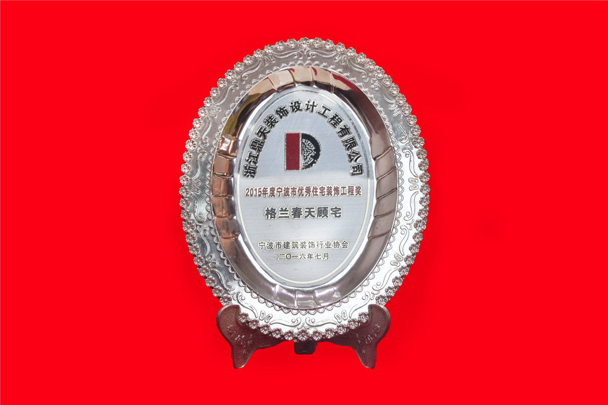 經(jīng)寧波市建筑裝飾行業(yè)協(xié)會公開、公平、公正的原則,鼎天裝飾再獲殊榮,評得“2015年度寧波市優(yōu)秀住宅裝飾設(shè)計獎”、“2015年度寧波市優(yōu)秀住宅裝飾工程獎”、“2015年度寧波市建筑裝飾裝修施工企業(yè)優(yōu)秀項目經(jīng)理”等榮譽獎牌及榮譽證書。