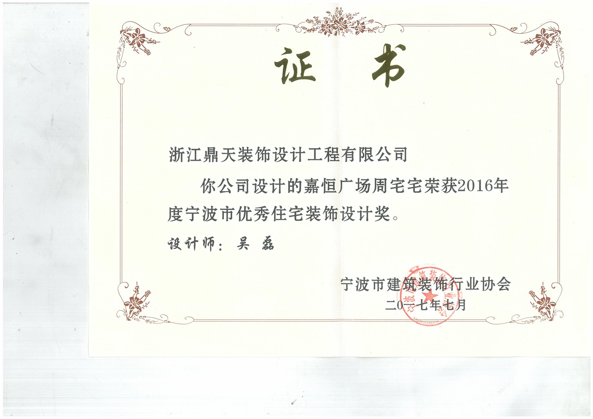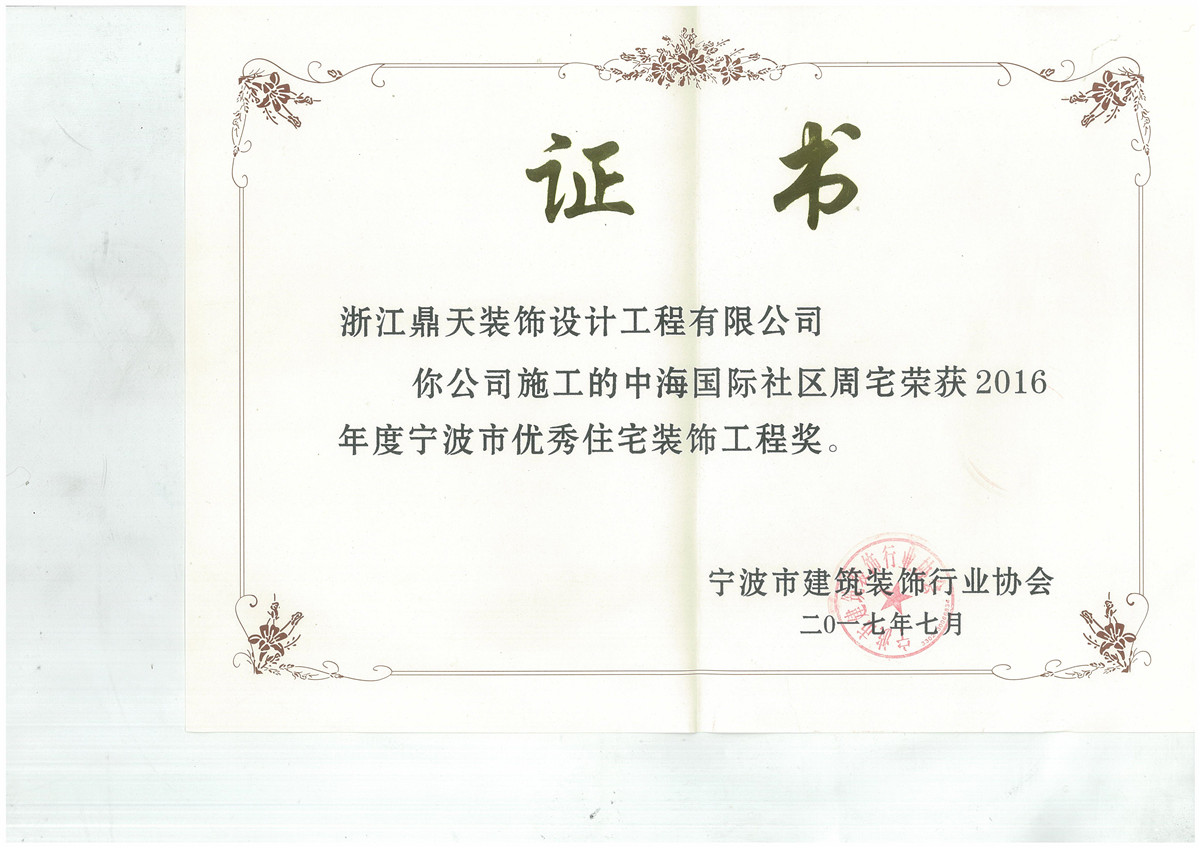 2016年度寧波市優(yōu)秀建筑裝飾工程獎(jiǎng)評(píng)選活動(dòng)于日前結(jié)束,經(jīng)過專家組對(duì)建筑裝飾企業(yè)申報(bào)工程的申報(bào)材料審查、現(xiàn)場(chǎng)復(fù)查以及網(wǎng)上公示等工作,共有3家裝飾企業(yè)的4項(xiàng)住宅裝飾工程獲得優(yōu)秀住宅裝飾工程獎(jiǎng),2家裝飾企業(yè)的4項(xiàng)住宅設(shè)計(jì)作品獲得優(yōu)秀住宅裝飾設(shè)計(jì)獎(jiǎng)。鼎天再次斬獲雙獎(jiǎng),繼行業(yè)2004年設(shè)立該獎(jiǎng)項(xiàng)以來,鼎天將連年榮獲“省市優(yōu)秀住宅裝飾工程獎(jiǎng)”、“優(yōu)秀住宅裝飾設(shè)計(jì)獎(jiǎng)”。