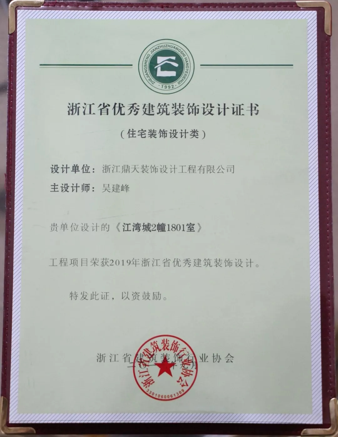 鼎天旗下設(shè)計(jì)師再次榮獲省級(jí)裝飾設(shè)計(jì)獎(jiǎng)項(xiàng)。2019年浙江省優(yōu)秀建筑裝飾設(shè)計(jì)獎(jiǎng)評(píng)選活動(dòng)已于日前結(jié)束,經(jīng)過專家組對(duì)建筑裝飾企業(yè)申報(bào)工程的申報(bào)材料審查、現(xiàn)場(chǎng)復(fù)核等工作,獲獎(jiǎng)名單已于近日釋出。鼎天裝飾于此次評(píng)選活動(dòng)中榮獲住宅裝飾設(shè)計(jì)分類下的優(yōu)秀建筑裝飾設(shè)計(jì)獎(jiǎng)。
